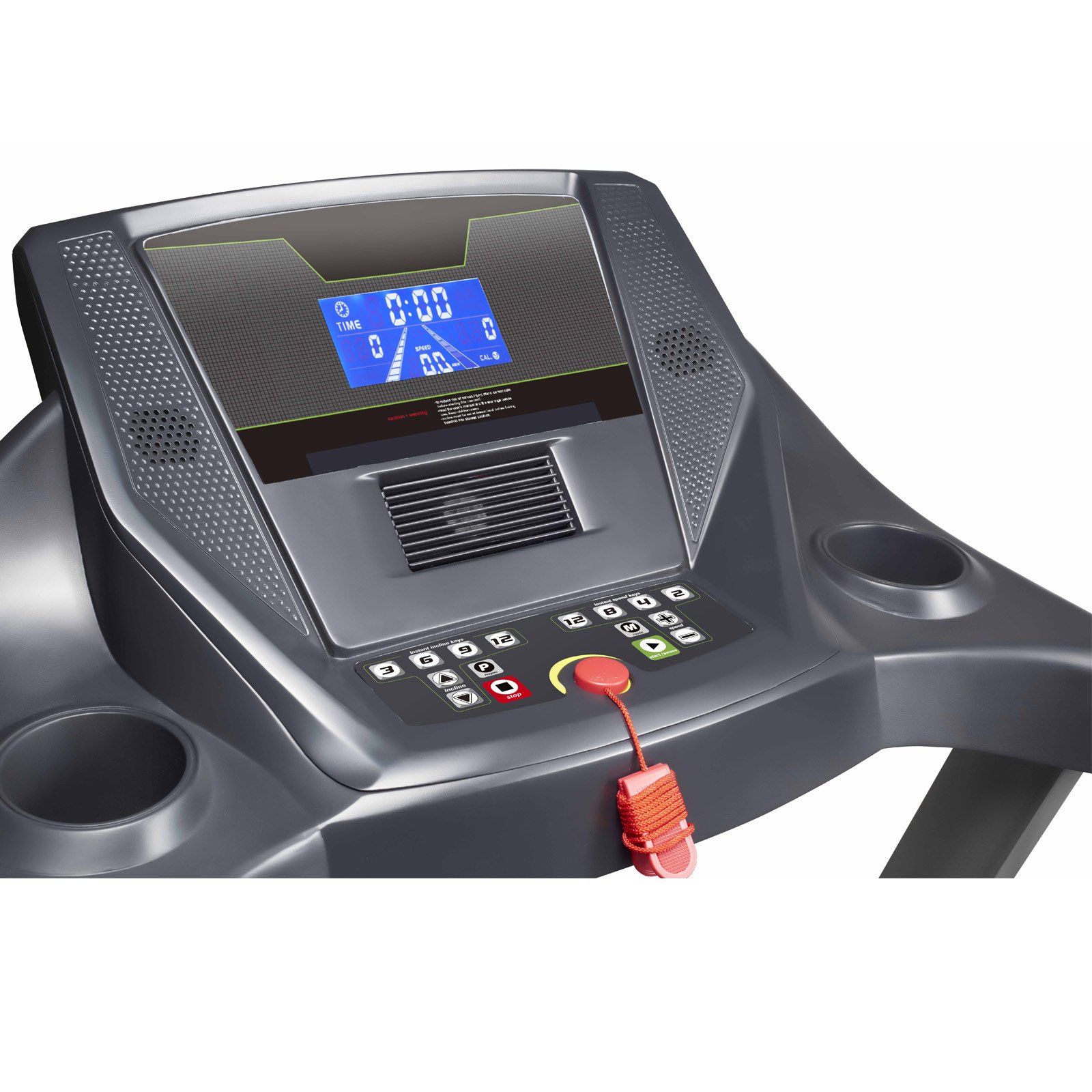 LCD displej s modrým podsvícením přehledně zobrazuje rychlost, čas, vzdálenost, kalorie, sklon i tepovou frekvenci. K dispozici je 40 přednastavených programů, 3 vlastní a 1 manuální režim.