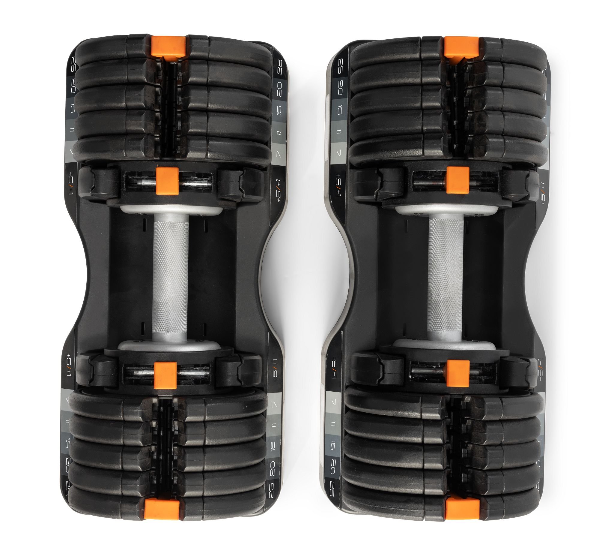Jedna činka nahrazuje 30 samostatných činek díky 25 úrovním hmotnosti. Hmotnost můžete rychle měnit po 1, 2 nebo 5 kg, v rozsahu od 5 do 25 kilogramů.