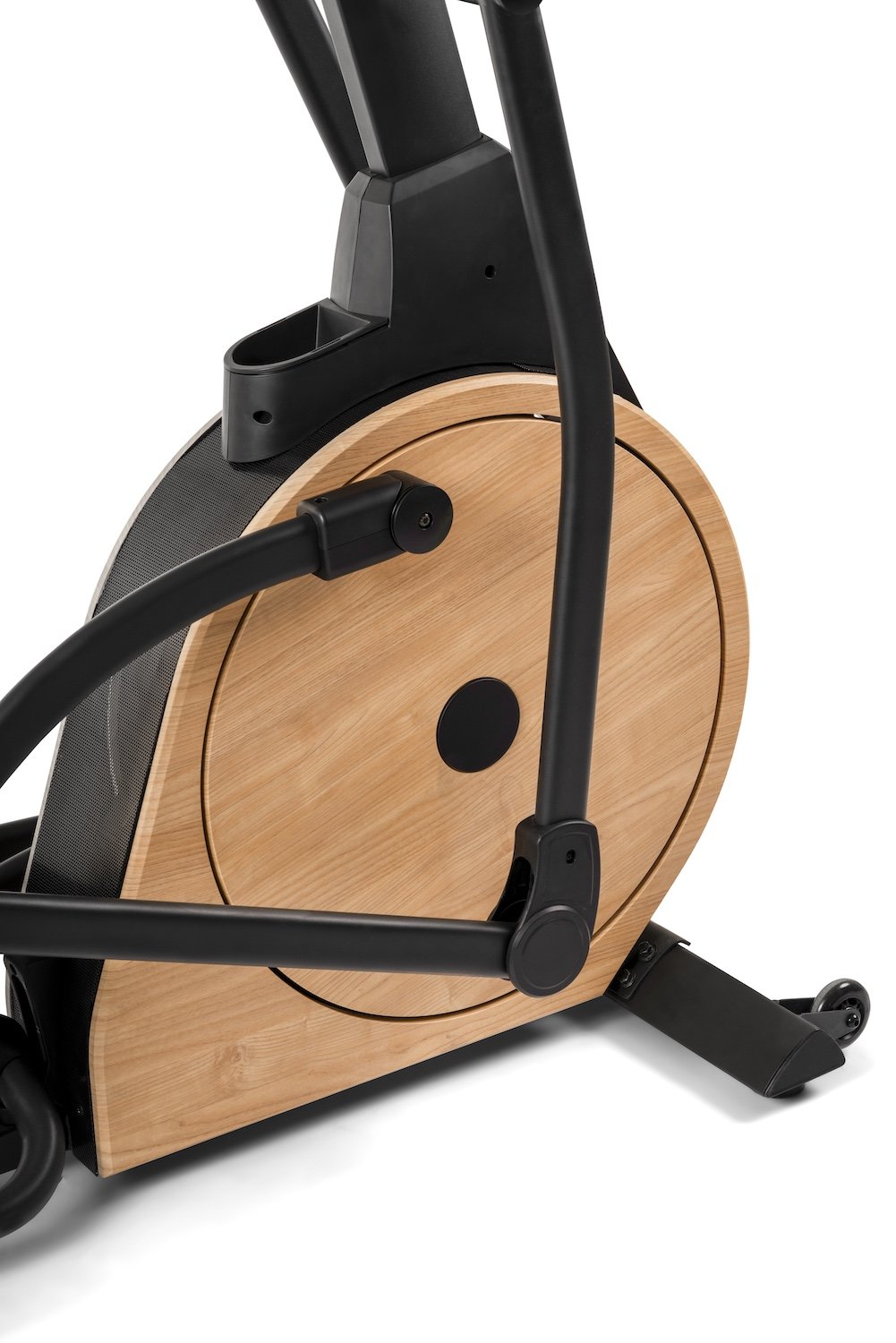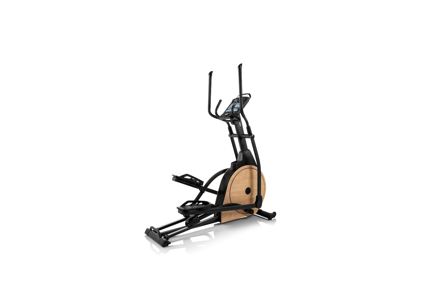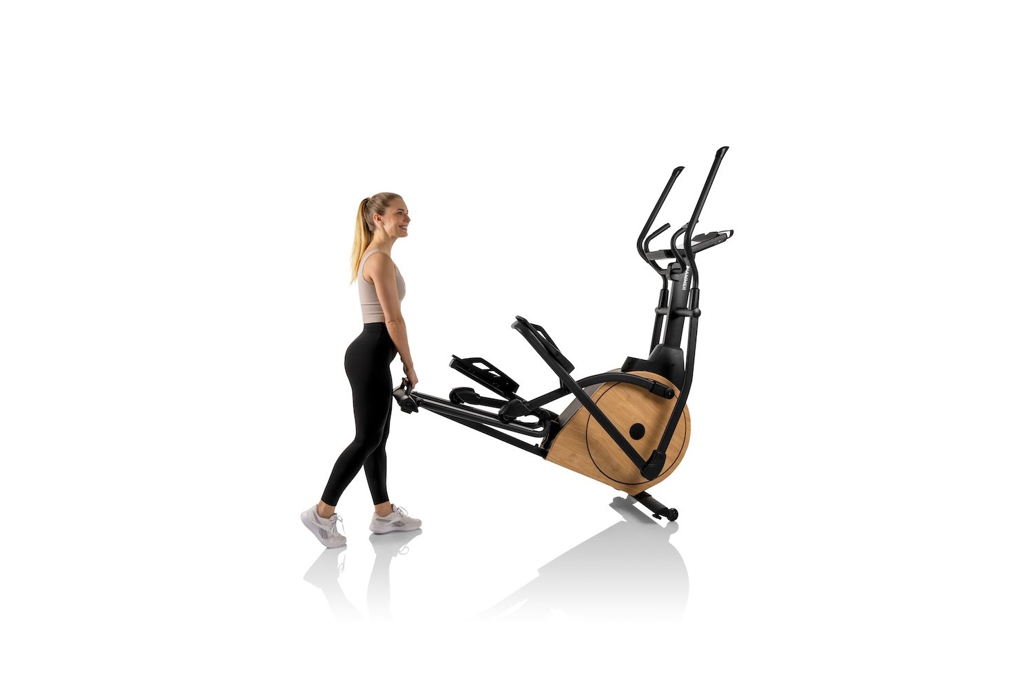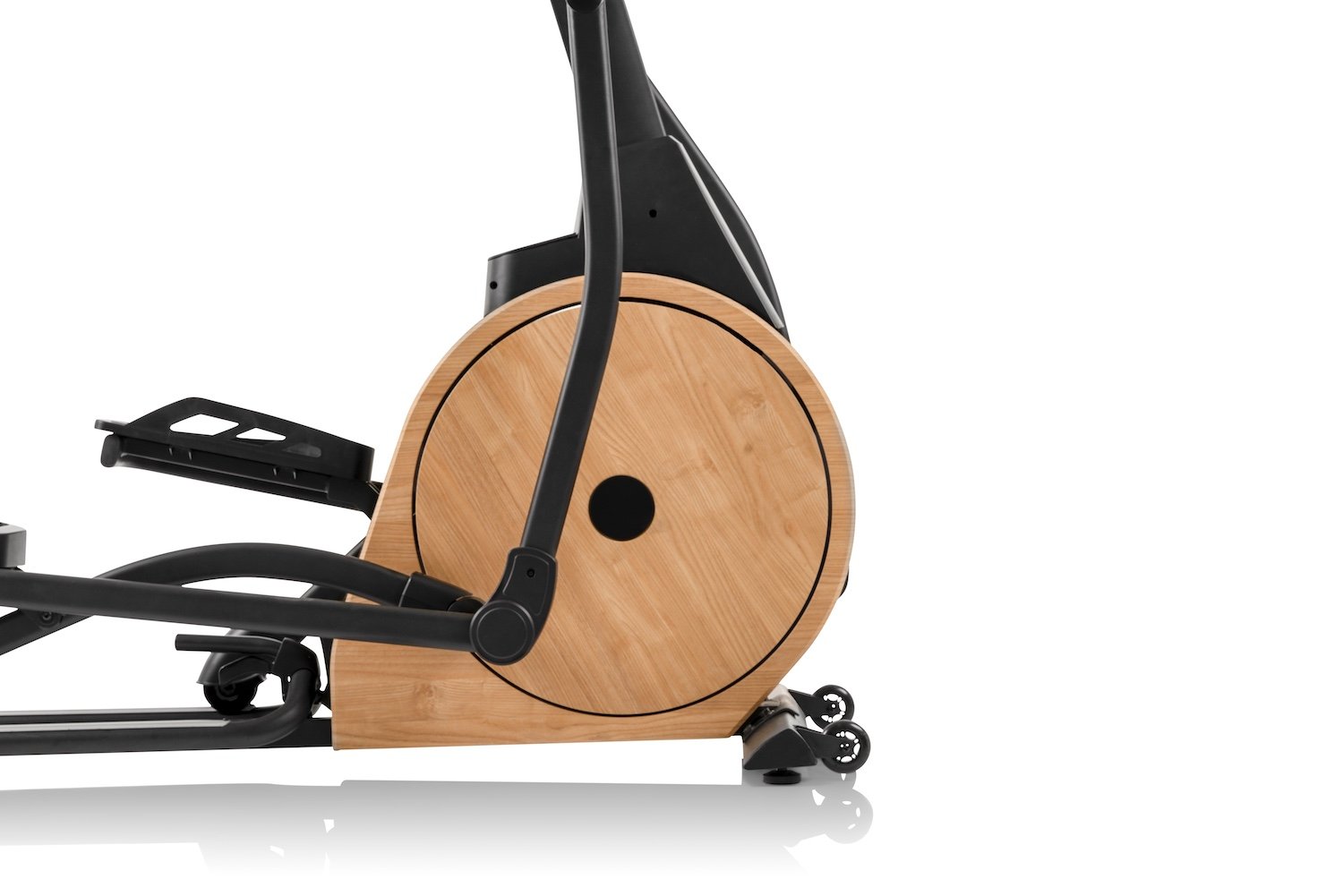 ID: 11003Prémiový eliptický trenažér v designu dřeva s dotykovým displejem, nastavitelným sklonem a Bluetooth pro trénink s aplikacemi Kinomap a Zwift.