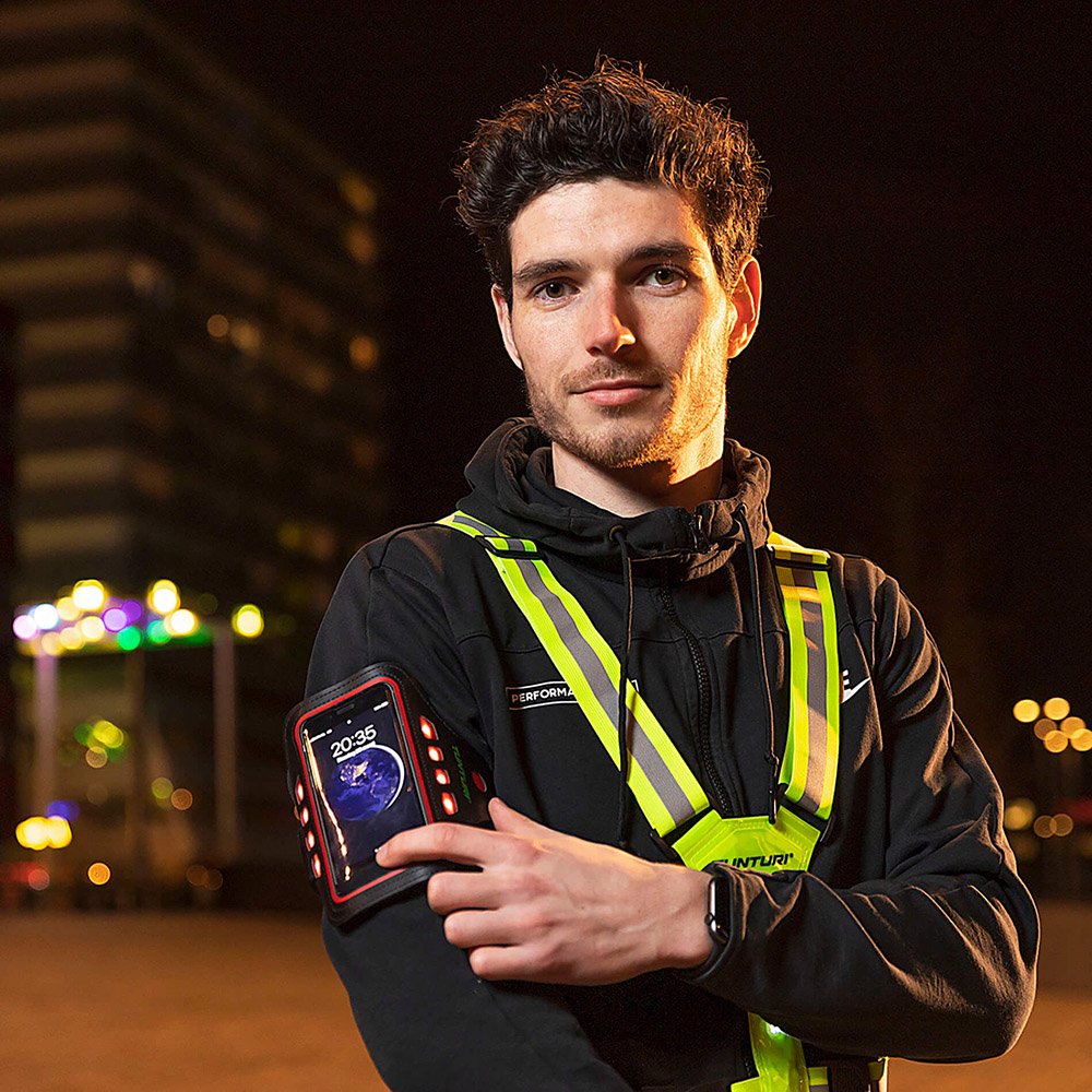 Komfortní pažní pouzdro na telefon. Extra viditelné LED diody po obou stranách telefonu. Včetně 2xCR2023 (vyměnitelné) baterií.