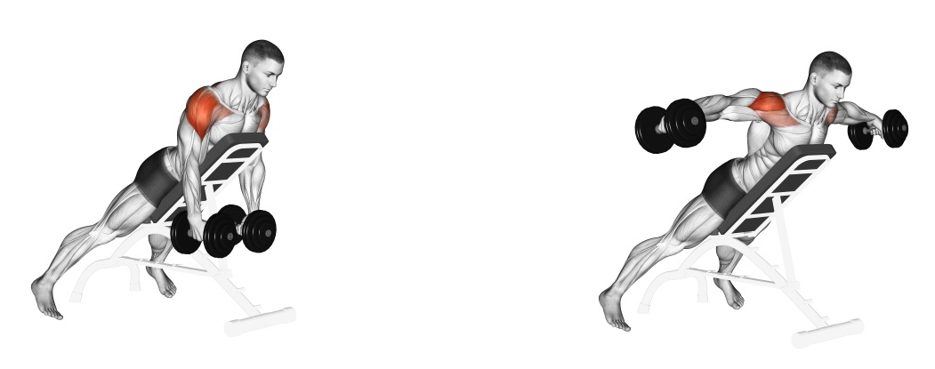 Upažování s jednoručkami vleže na šikmé lavici nedovolí využít dopomoc těla a představuje velmi striktní variantu izolující zadní část deltových svalů. Lavičku si v první řadě nastavte na úroveň sklonu přibližně 45° a následně se o ni opřete břichem tak, aby jednoručky směřovaly dolů pod trup. Jednoručky uchopte způsobem, aby dlaně směřovaly směrem k sobě. Kontrakcí zadní částí ramen upažte činky na úroveň hlavy, aby se paže dostali na rovnoběžnou hladinu se zemí. Poté se opět vraťte pomalým pohybem do původní pozice. Velmi častou chybou u tohoto cviku je zvedání hrudníku od podložky, proto si hlídejte, aby byl váš hrudník po celou dobu cviku položený na lavici.