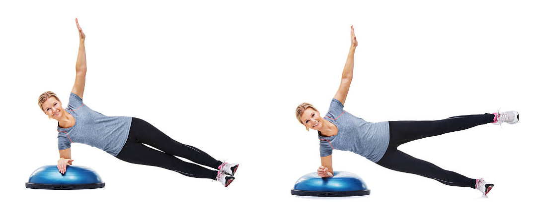 - U tohoto cviku musí být tělo narovnané a je důležité nezaklánět hlavu a nehrbit páteř. Jednou rukou se opřete předloktím o balanční podložku a druhou volnou ruku můžete mít buď v bok, nebo ji zvedněte kolmo směrem nahoru. Nohu mějte nataženou a pomalu s ní kmitejte nahoru a dolu. Po cviku vystřídejte nohy.